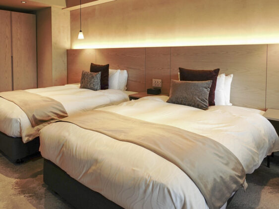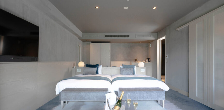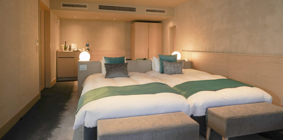 ご家族や親しい友人とともに、寛げる琉球畳の和室と川のせせらぎが耳に優しい非日常感たっぷりのお部屋です。寝心地にとことんこだわったNICAオリジナルのベットやイタリアの輸入家具。
